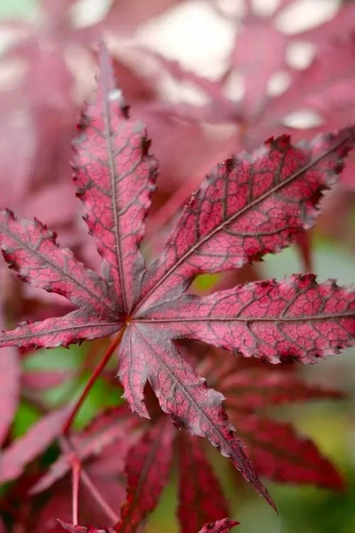 One of the best of the Ghost-like Japanese Maples, ‘Amagi Shigure’ sports coloration like no other. It spring, the leaves emerge an eye-catching brilliant fuchsia with deep purple-black veining. By summer the leaves have turned to a deeper brick red color with blackish green veining. Leaves that get more shade take on a pale whitish-pink tone with vibrant green veining. With the arrival of cooler temperatures in fall the leaves turn bright orange and red shades with maybe some purple. The bark has amazing coloration as well. The newest stems are a cherry-brown color aging to a soft grey-jade. The oldest branches are a dusty grey-grown. Reaching 10 to 12 feet tall and half as wide at maturity, with a full-but-not-dense look that shows off the foliage as well as the bark, Amagi Shigure is a fine specimen for smaller garden spaces and containers.
