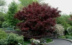 One of if not the most popular Japanese Maple cultivars among home gardeners and landscape architects alike, ‘Bloodgood’ is a stately specimen that begins the season with burgundy-red leaves emerging in spring that turn to deep burgundy purple in summer and finally in fall to a flaming bright red. Bloodgood will tolerate full sun however in the South will appreciate some filtered sun or shade in the afternoon. Bloodgood has an upright habit and rounded form with a moderate growth rate to 15 to 20 feet tall and wide at maturity.