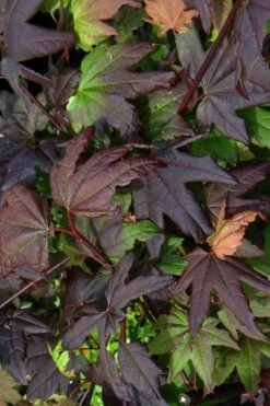 Closely related to Japanese maples, ‘Burgundy Jewel’ is a fantastic selection of Vine Maple showing off very large leaves in unusual colors that change through the seasons. Spring leaves are a deep purplish burgundy wine holding their color well into summer. By the end of summer the leaves transition to coppery and green shades. Cool temperatures in fall bring a kaleidoscope of colors in shades of orange, scarlet, burgundy and deep maroon reds. In winter the deep reddish-purple branches and stems take the stage. Foliage colors are more intense with more sun, so we suggest at least 5 or more hours of direct sunlight per day. Burgundy Jewel forms an erect vase shape up to 8 feet tall and 4 feet wide at 10 years of age. Excellent as an accent or specimen in smaller garden spaces, home foundation plantings and around patios and other outdoor living spaces. Can be grown as a multi-stemmed shrub or lower branches can be removed to form an attractive multi-trunk small tree.