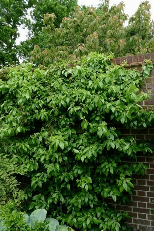 Growing up to 60 feet feet tall, this Decumaria will easily cover a tree trunk or any porous wall or garden structure in the landscape, and it does it quickly. It’s delicate aerial rootlets will cling to just about any surface without causing damage.