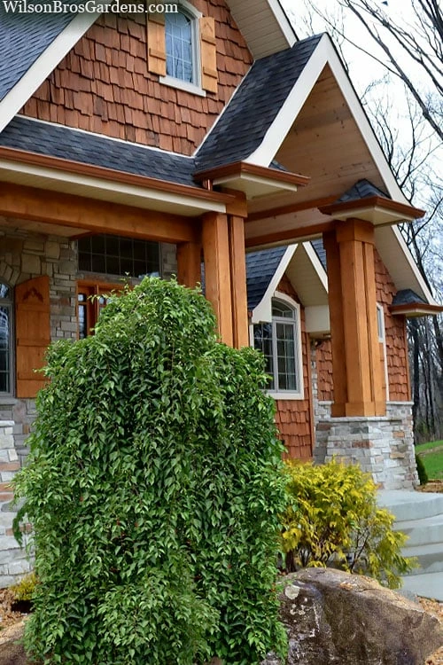 PLEASE NOTE: This variety is a cross between ‘Rosea’ and ‘Carillon’, which gives it it’s more compact and weeping habit. The plants we grow will look low and mounding. As the tree grows it will form a central leader that grows more upward. The central leader can also be trained to grow upright by attaching a bamboo or other type of stake to it.