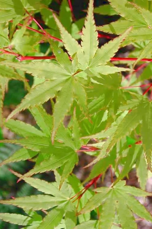 In spring, the leaves of the Japanese Sunrise Maple emerge a brilliant lime green, which contrasts beautifully with the branch colors. The leaves turn a handsome darker green as summer arrives, then changing to a remarkable shades of yellow, orange and red in fall.