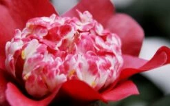Lipstick is an extremely rare and absolutely unique and beautiful Camellia that produces deep red single petaled flowers with an anemone-like pom pom of red and white freckled petaloides at the center and sometimes yellow stamens peaking out. The flowers appear in late winter and continue through mid spring against glossy dark green foliage that serves as a perfect backdrop for the flowers. The flowers are excellent for cutting and display in indoor flower arrangements. A must have for camellia enthusiasts and collectors as well as those who love unique and interesting flowers.