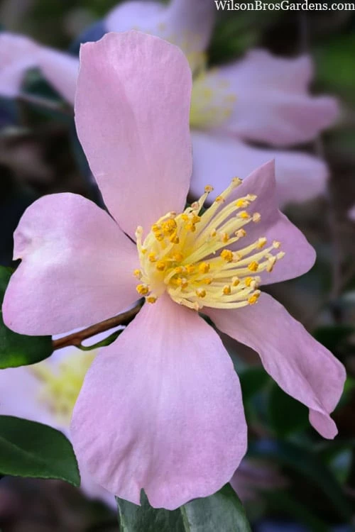 One of the most floriferous of the fall blooming Camellia sasanquas in our gardens, ‘Maiden’s Blush’ is clothed in very pretty clematis-like and delicately fragranced single flowers with blush pink petals surrounding a prominent boss of creamy yellow gold-tipped stamens. The flowers are produced over a long period in fall to early winter and stand out beautifully against lustrous, dark green foliage on a dense and upright rounded evergreen shrub or small tree up to 12 feet tall and 10 feet wide over time. One look at this blushing beauty in fall and you know what inspired her name!