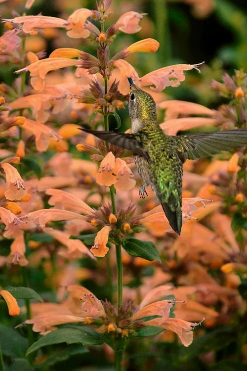 One of the top hummingbird attractors in our gardens, Mango Tango Agastache, commonly called Hummingbird Mint or Anise Hyssop, is a vigorous growing compact selection to 18 inches tall featuring abundant spikes of tubular flowers in unusual peach to dusky orange shades. You won’t have any other flowering plant in your gardens that produces the same color as flowers as mango Tango. Blooming over a long period summer through early fall, the tubular, nectar-rich flowers on abundant tall spiked clusters were perfectly designed for hummingbirds and butterflies. The flowers stand out nicely against the green, licorice-mint-scented foliage. Provide a full to mostly sunny location in a well-drained soil for optimum health and flowering.