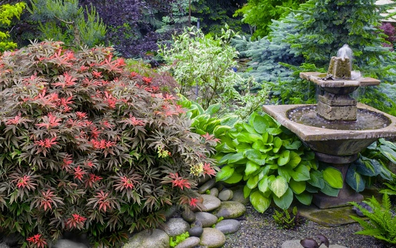 Note: One Japanese Maple can make a landscape…that is, if you don’t overcrowd it with other trees and plants. Therefore, when choosing companions to plant under or around your Japanese Maple, make sure to select low-growing shrubs or groundcover plants that won’t interfere at all with your tree.