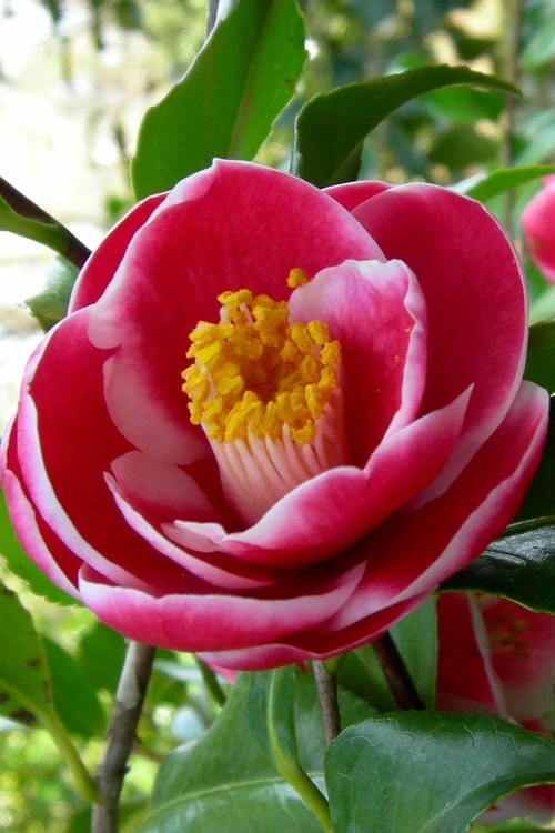From late winter through early spring the Sadaharu Oh Camellia features 3 to 4 inch diameter semi-double flowers with several unique variations in form and color, which is always a pleasant surprise. Petals can range from a deep rose pink to brilliant red edged with a thin to wide white border surrounding a prominent patch of golden-yellow stamens. The plant in our gardens has an attractive semi-weeping form with dark green evergreen foliage that is the perfect backdrop for the colorful flowers. To enjoy the flowers indoors, display several cuttings in a vase. Sure to be a conversation piece in the garden!