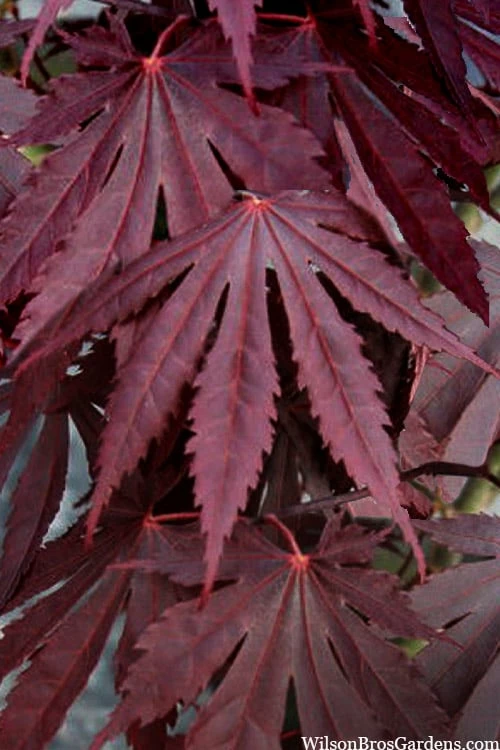 A unique and elegant Full Moon Japanese Maple, ‘Yasemin’ features unusual leaves with 7 to 9 pointed lobes that are divided in such a way that they resemble an open hand with outstretched fingers. In early spring the leaves emerge a purplish red transitioning to a shiny, deep burgundy-maroon. This color holds well through summer eventually turning to a deep bronze. With the arrival of cooler temperatures in fall the leaves change to a glorious scarlet red. Dark purple-black bark contrasts beautifully with foliage and provides interest in the landscape during the leafless winter months. Upward facing samaras in spring provide additional interest. Yasemin has the typical shape of an Acer shirasawanum (Full Moon Maple) with an upright habit and broad spreading crown. You can expect an 8 to 10 feet tall and nearly as wide tree in 10 years and maybe twice that size or more at maturity. An adaptable variety that thrives in full sun or part shade and has superior cold and heat tolerance in USDA Zones 5a to 9b.