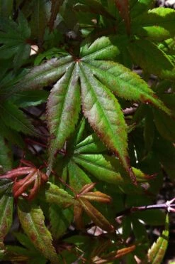 Acer palmatum Yezo nishiki has rich, bright reddish-purple spring color which turns to a deeper color as summer progresses. In hot sun exposure, the leaves on Yezo nishiki tend to bronze out with greenish color in the veins. Yezo nishiki has fall colors are fiery orange – scarlet red. A large upright and spreading tree to about 20 ft. Hardy.
